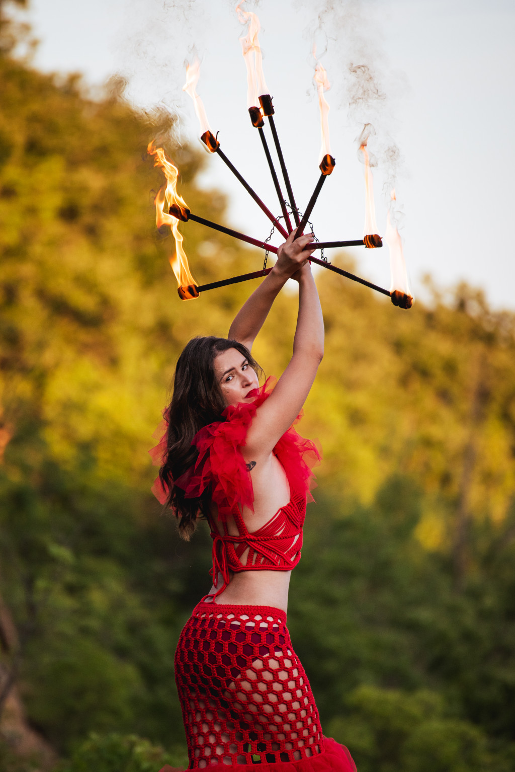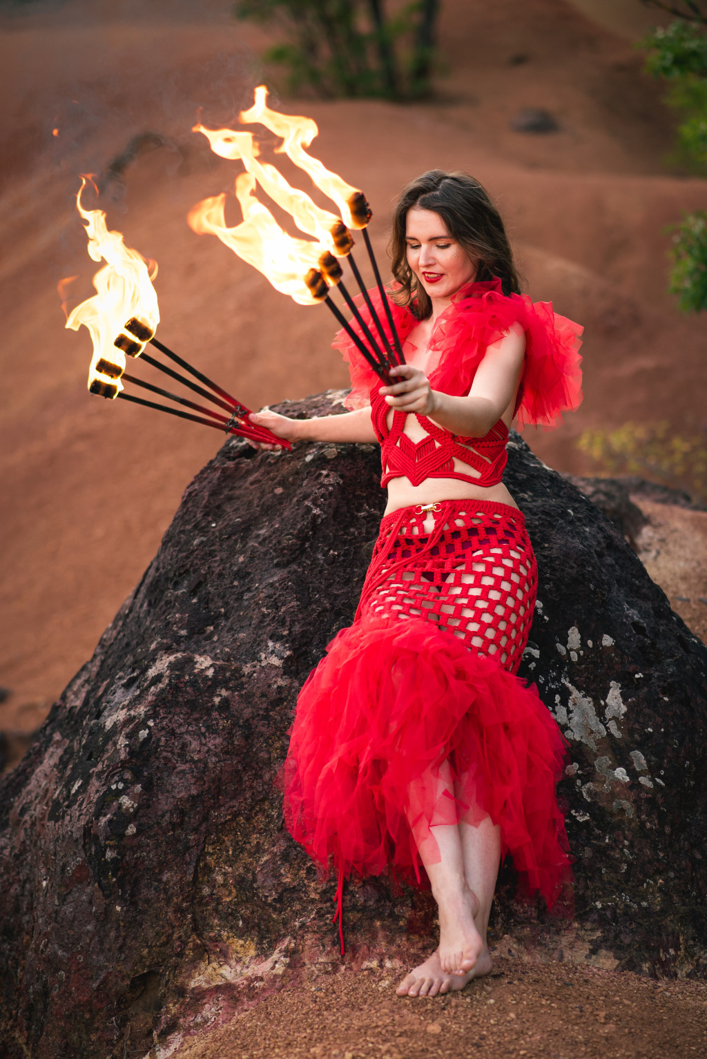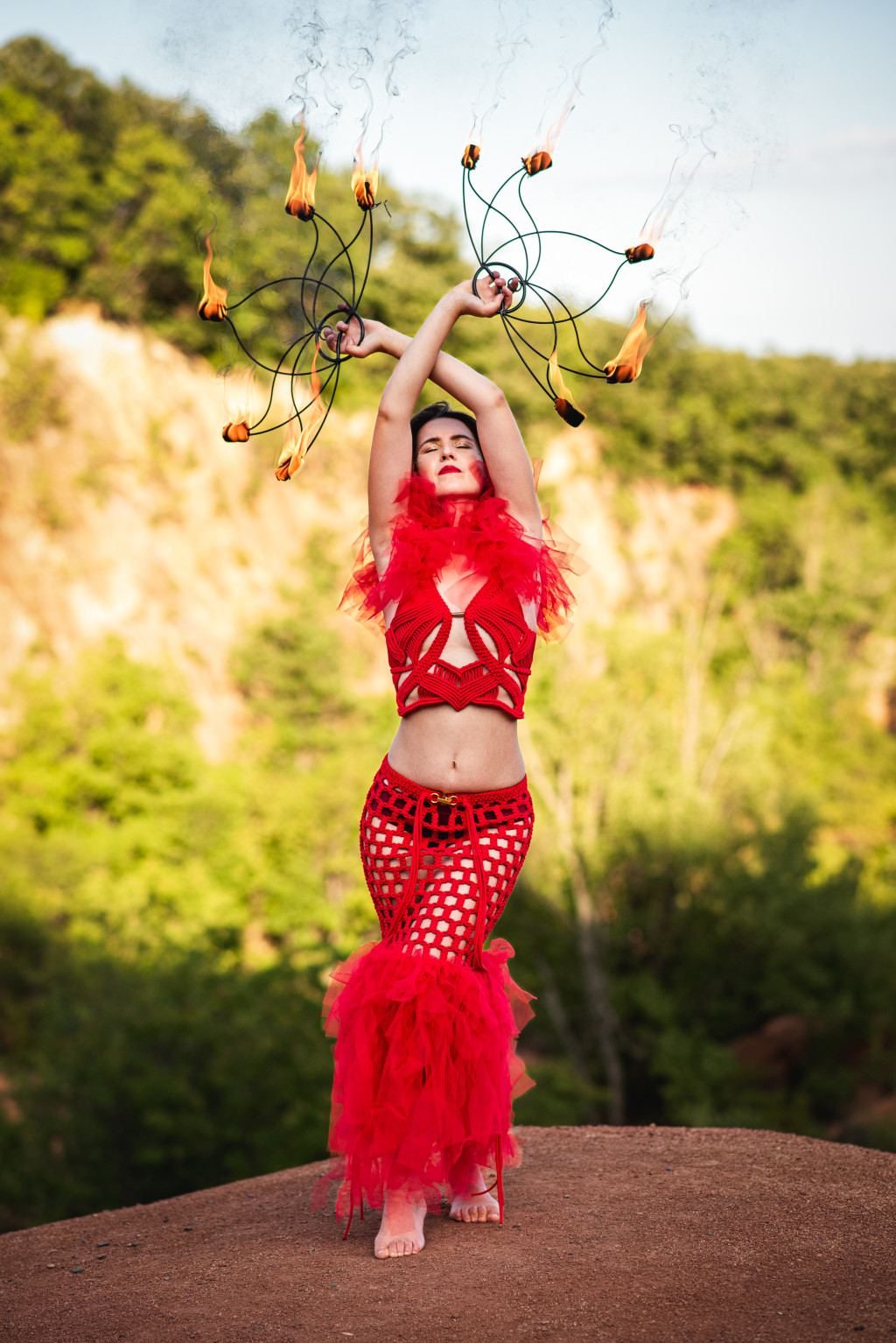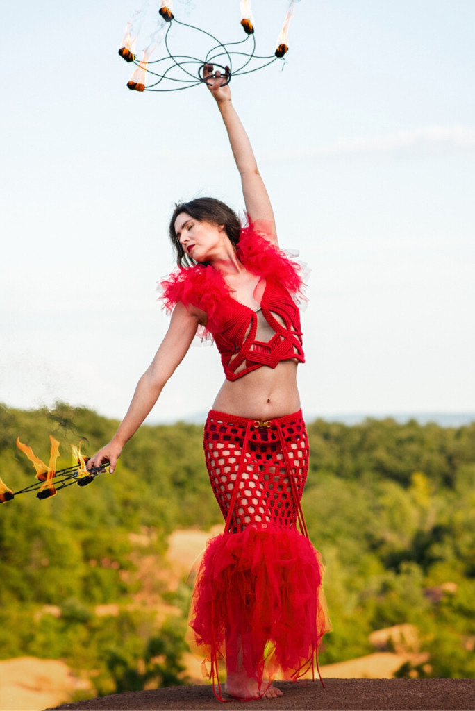 Hand-knotted macramé skirt made of natural cotton cord with elegant gold-tone metal embellishment. Inspired by the fierce and passionate movement of fire, this skirt radiates strength, femininity, and allure.